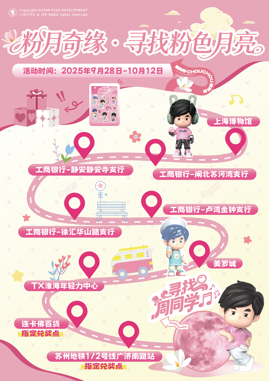 此次活动由 “周同学” IP 版权方巨星传奇联合久事文传、中国工商银行上海市分行、苏州地铁共同打造,以 “线上 + 线下” 收集碎片的创新玩法,将中秋 “团圆” 的传统寓意悄悄融入都市公共空间。当粉色月光洒满双城角落,“周同学” 也不再只是潮流符号,更成为连接多元场景、为区域文旅融合注入温情的情感载体。
